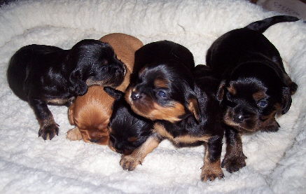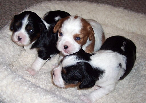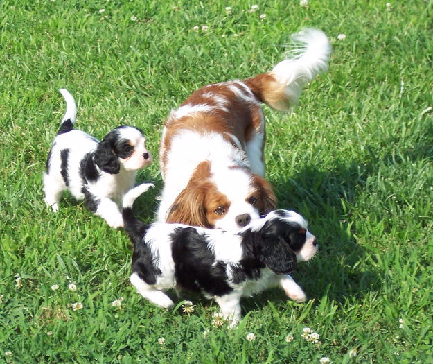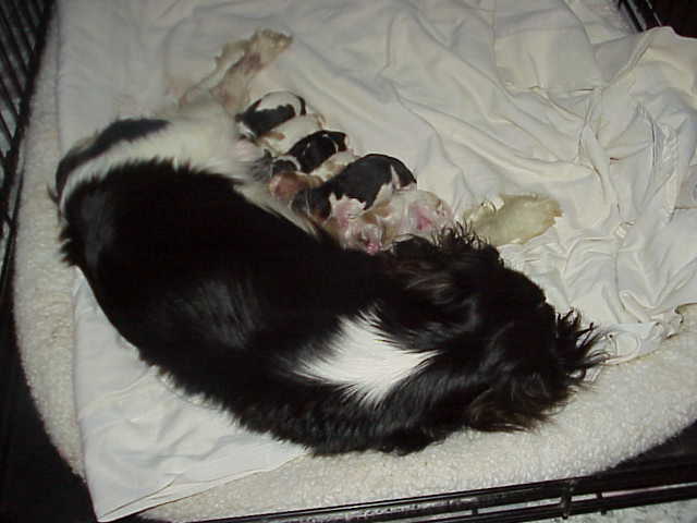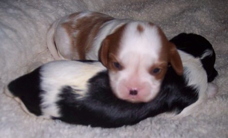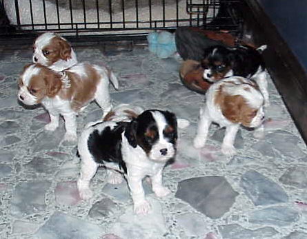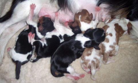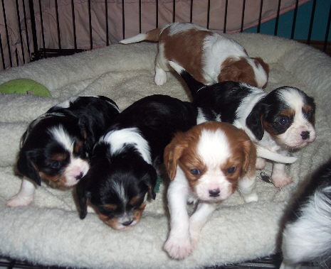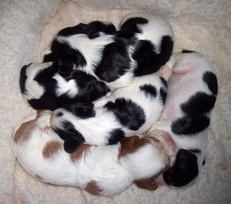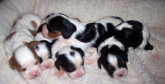 Daisy litter: Two tri girls, two tri boys, one blenheim boy.